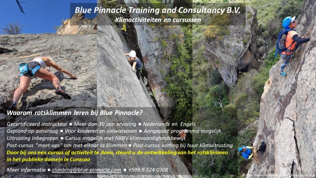 De mogelijkheden om het rotsklimmen te beoefenen op Curacao groeien snel. Blue Pinnacle Training and Consultancy ondersteunt actief de ontwikkeling van infrastructuur voor het beoefenen van deze sport. Verder kunnen op basis van ruim 30 jaar ervaring op dit gebied cursussen rotsklimmen aanbieden op verschillende niveau’s, van beginners tot vergevorderd; en ook de (semi-)instructeursopleiding ‘belay and rappelling coach’. Wij verzorgen deze cursussen via de Blue Pinnacle Rock Climbing Academy. De cursussen hebben tot doel de deelnemers in staat te stellen veilig en zelfstandig deze avontuurlijke activiteit te kunnen beoefenen. De inhoud is gebaseerd op in West Europa en Nederland geldende veiligheidsnormen.